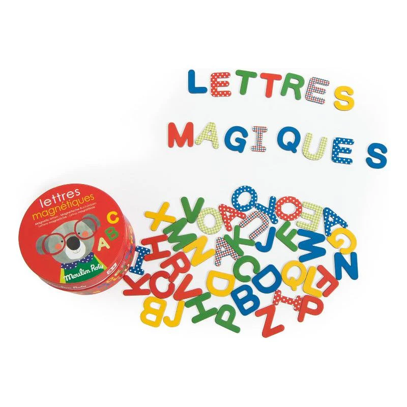 Housed in a bright red round box that little ones can't wait to open, this set includes 54 magnetic cardboard letters perfect for learning the alphabet and writing your first words while having fun.