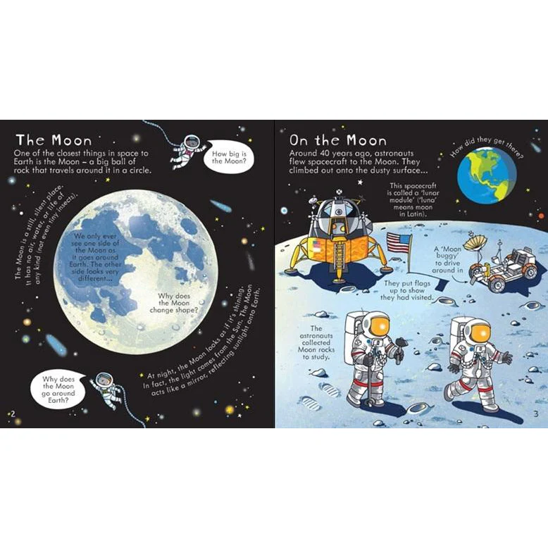Why do stars shine? And how was the moon made? Children can blast off into space with this fantastic interactive discovery book revealing the secrets of the Universe. Vibrant illustrations and simple explanations combined with over 70 flaps to lift. Each double page covers a different topic, including ‘Glittering galaxies’, ‘On the Moon’ and ‘Space Station’.