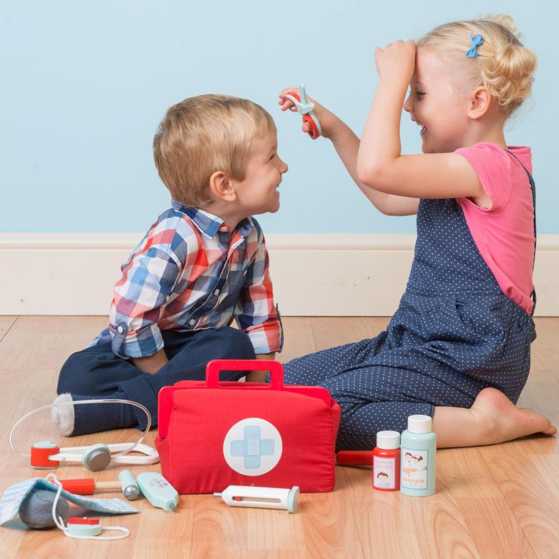 A bright red vintage-style fabric bag with sturdy wooden handles, plus 9 colourful wooden accessories—stethoscope, thermometer, needle, surgical scissors, ointment, and more! 🩺🌡️